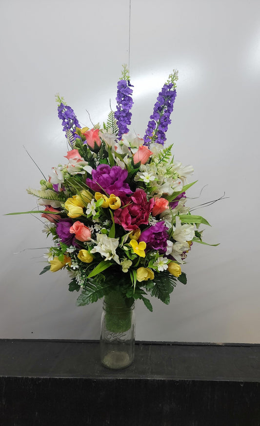 26" Tall Premium wildflower Cemetery Vase Spring Flowers, tulips lilies yellow, Large Cemetery Arrangement for Memorial Vase