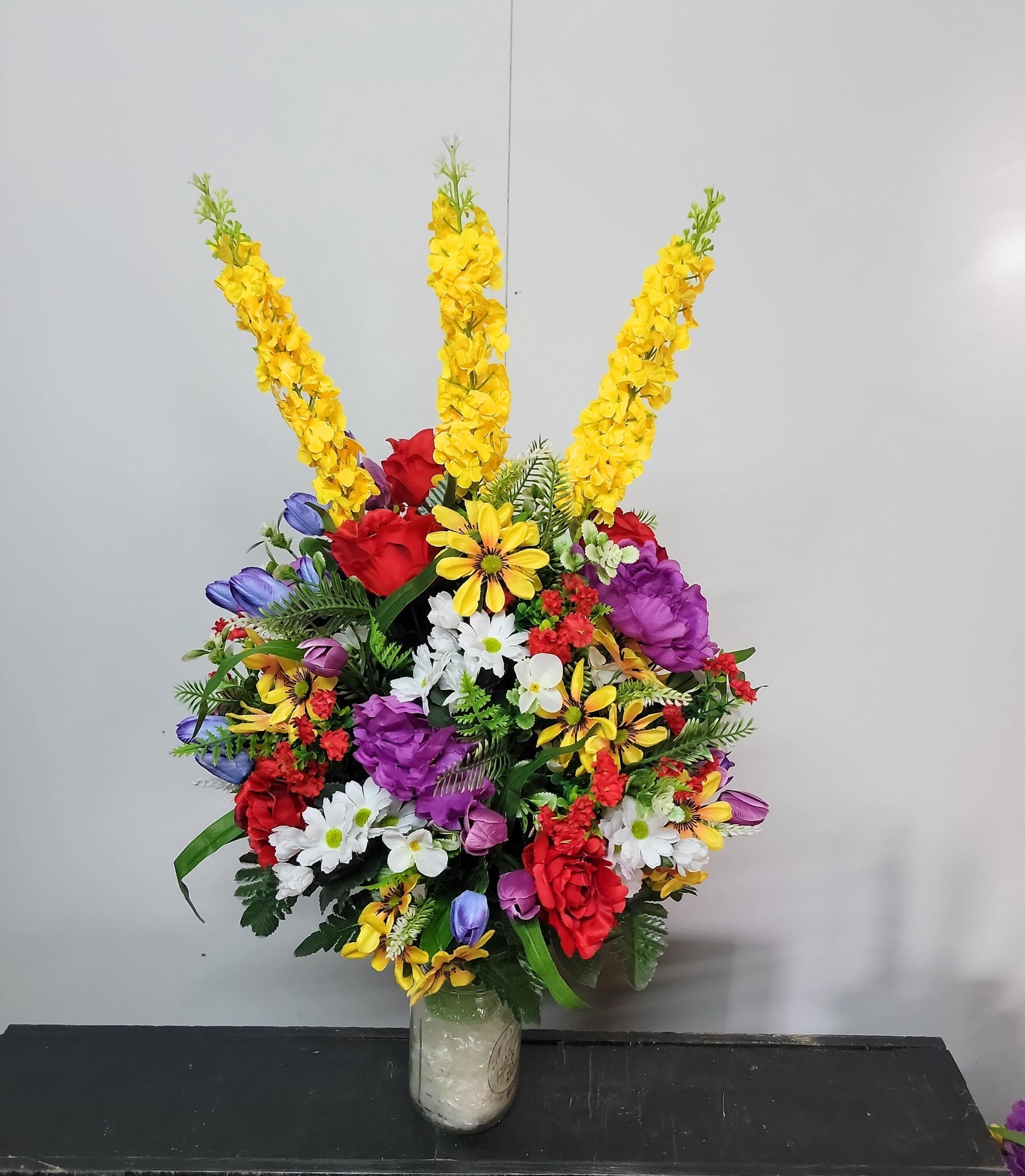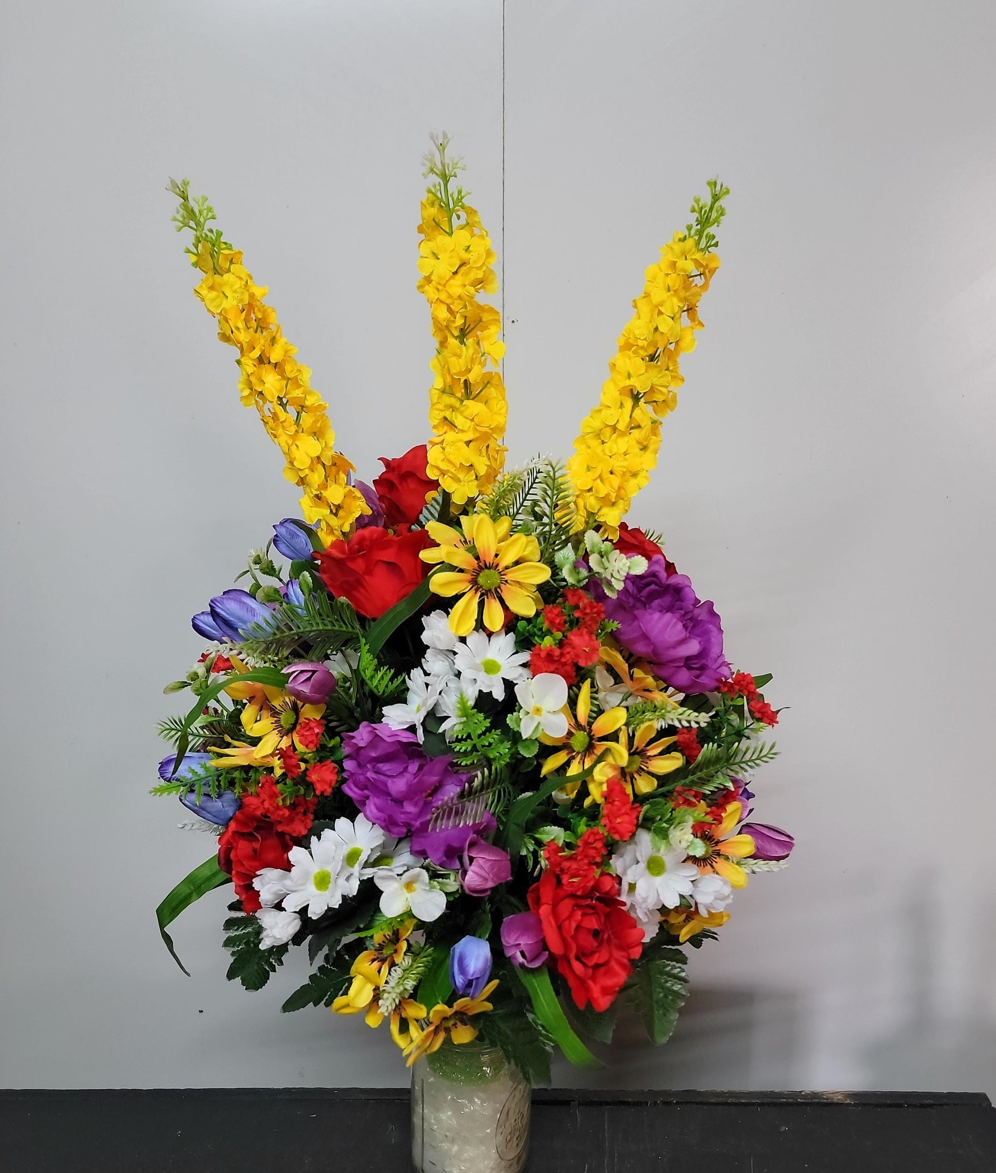 Designed with premium red roses , purple tulips and yellow wildflowers that are realistic faux flowers.