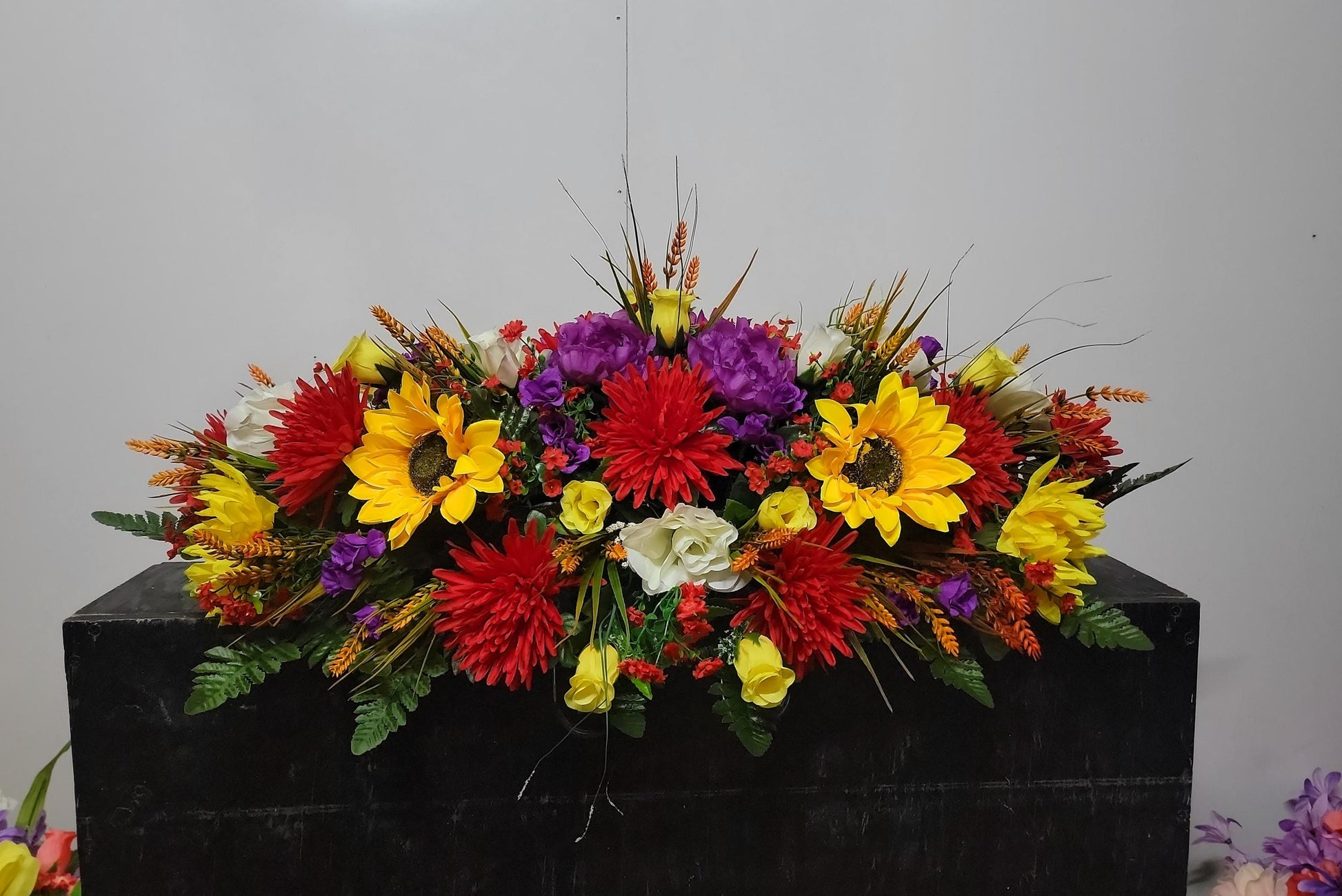 This is a handmade with love cemetery saddle. Designed full of spring wildflowers and red spider mums .